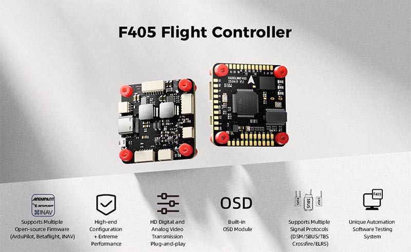 A RadioLink F405 repülővezérlő egy mindent-egyszerre megoldó repülőirányító rendszer, amely magas teljesítményt, kivételes megbízhatóságot és intelligens tervezést integrál, a versenyzésre szánt drónok, repülőgépek és többrotoros UAV-k többfelhasználós alkalmazási lehetőségeihez szabva.