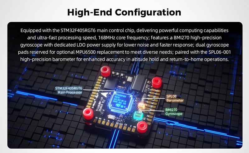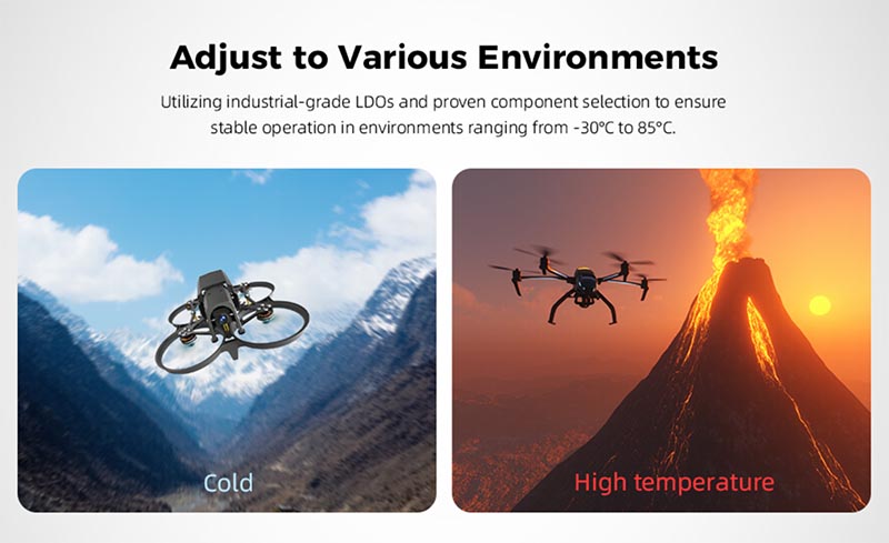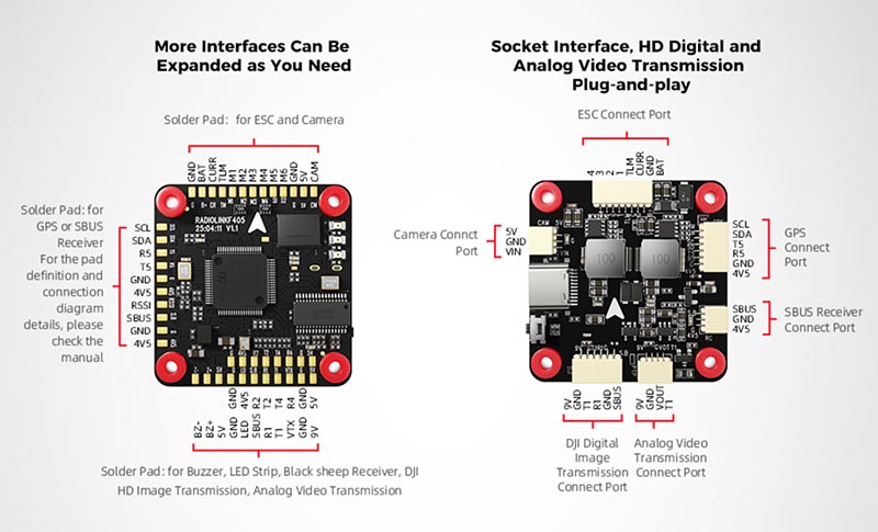A kompakt 30,5×30,5 mm-es méreten belül az F405 6 kimeneti csatornát támogat és kompatibilis széles modellválasztékkal, beleértve 2-6 tengelyű többrotorosokat, szárnyas repülőgépeket, helikoptereket, repülőszárnyakat, autókat, hajókat, robotokat, fűnyírókat és csalihajókat. Aljazat csatlakozók, HD digitális és analóg videóátvitel plug-and-play: Egy 6 tűs aljazat csatlakozó, amely a DJI nagyfelbontású digitális képátvitel plug-and-play használatához készült. Egy 4 tűs VOUT aljazat csatlakozó az analóg képátvitel csatlakoztatásához van tervezve. További interfészek igény szerinti bővítése: Az aljazat csatlakozók és a forrasztási padok kombinálásával további interfészek bővíthetők a repülővezérlő méretének megváltoztatása nélkül, hogy több DIY funkció igényeit kielégíthesse.